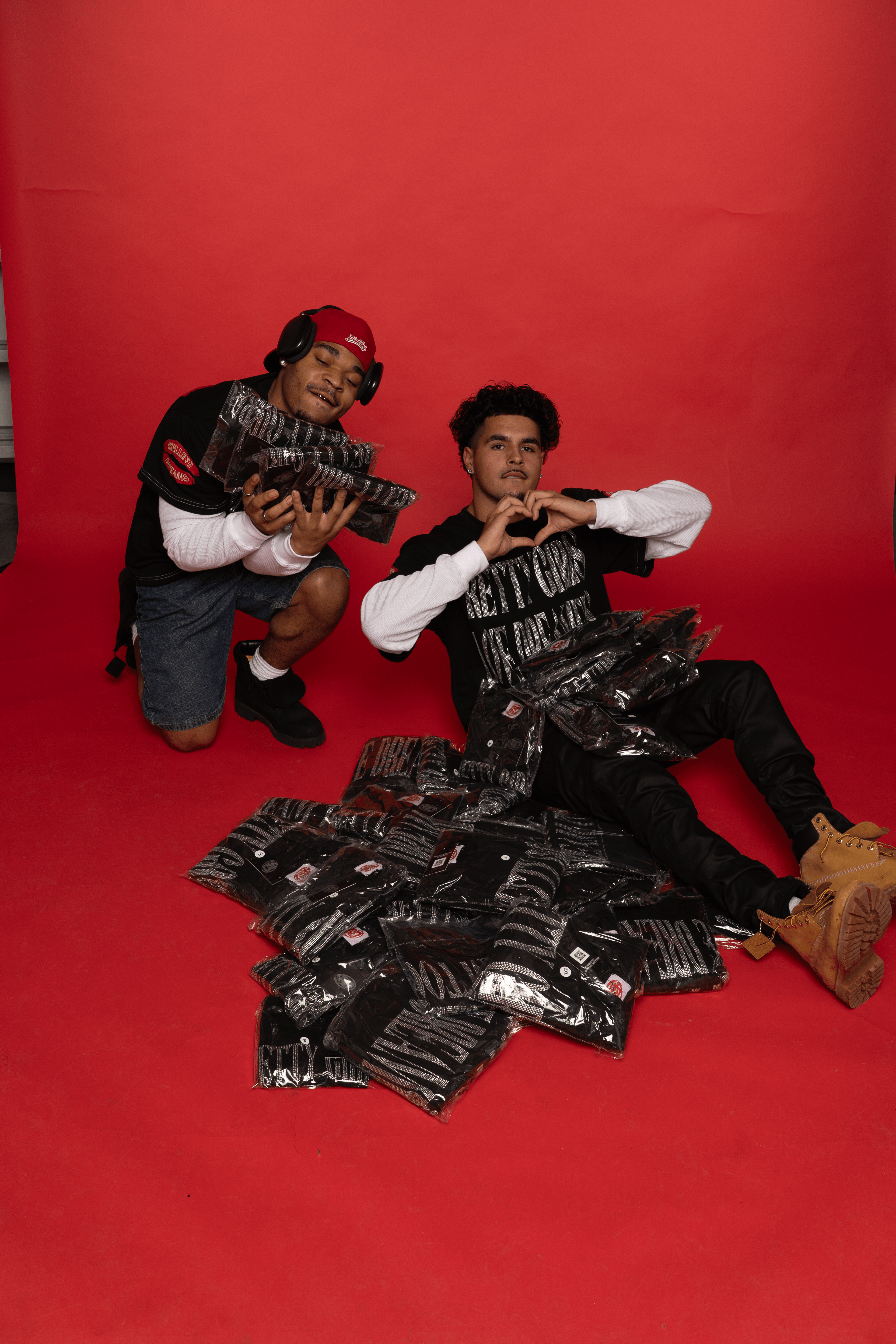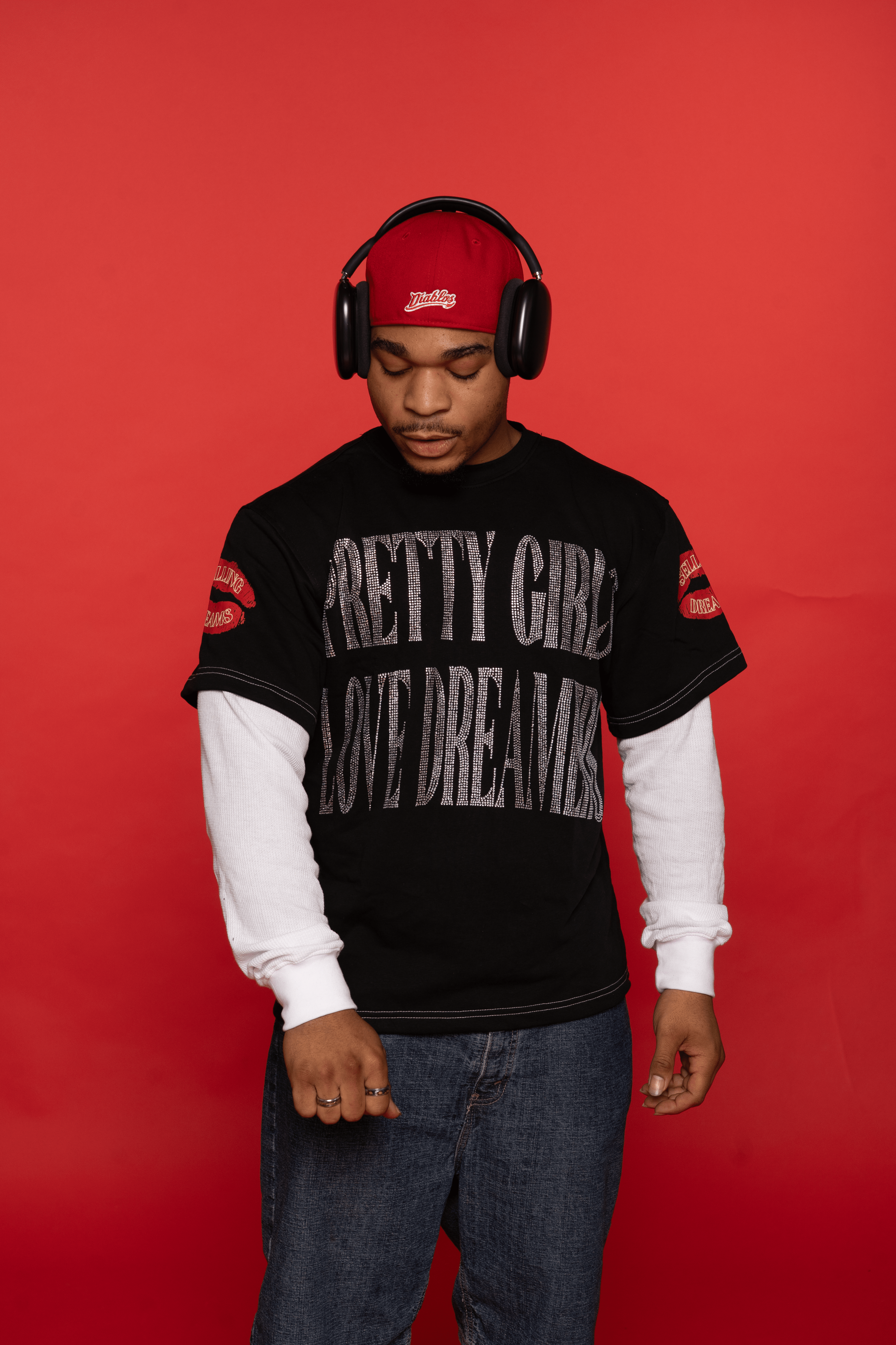 The unisex double layered T complements it perfectly, crafted for a relaxed fit with the statement: "Pretty girls love dreamers" in bold rhinestones across the chest. The shoulder and back screenprint detail echoes the female version, tying the look together while allowing each piece to shine on its own.