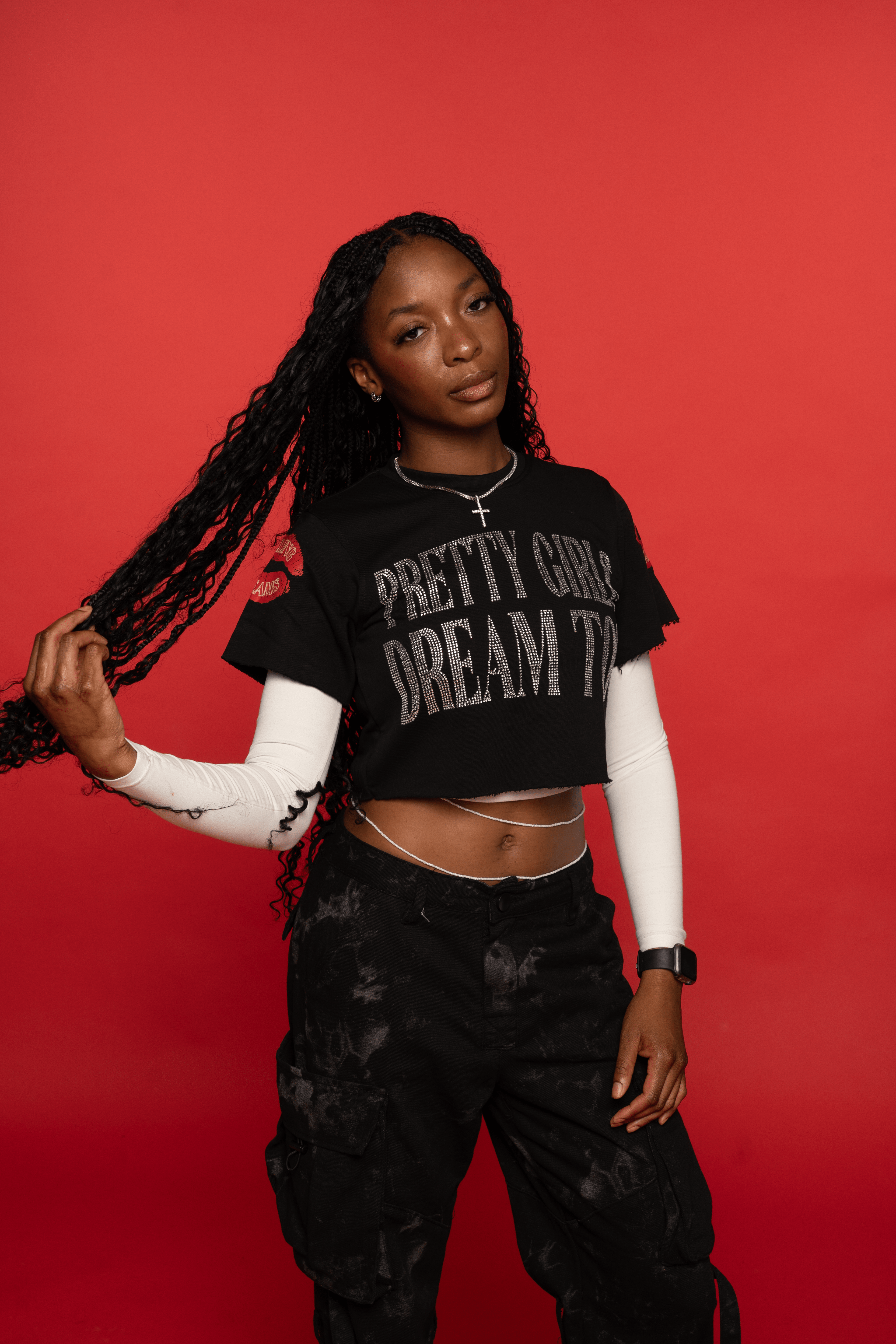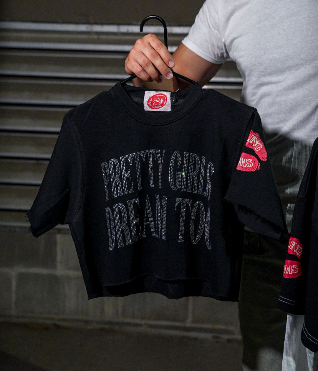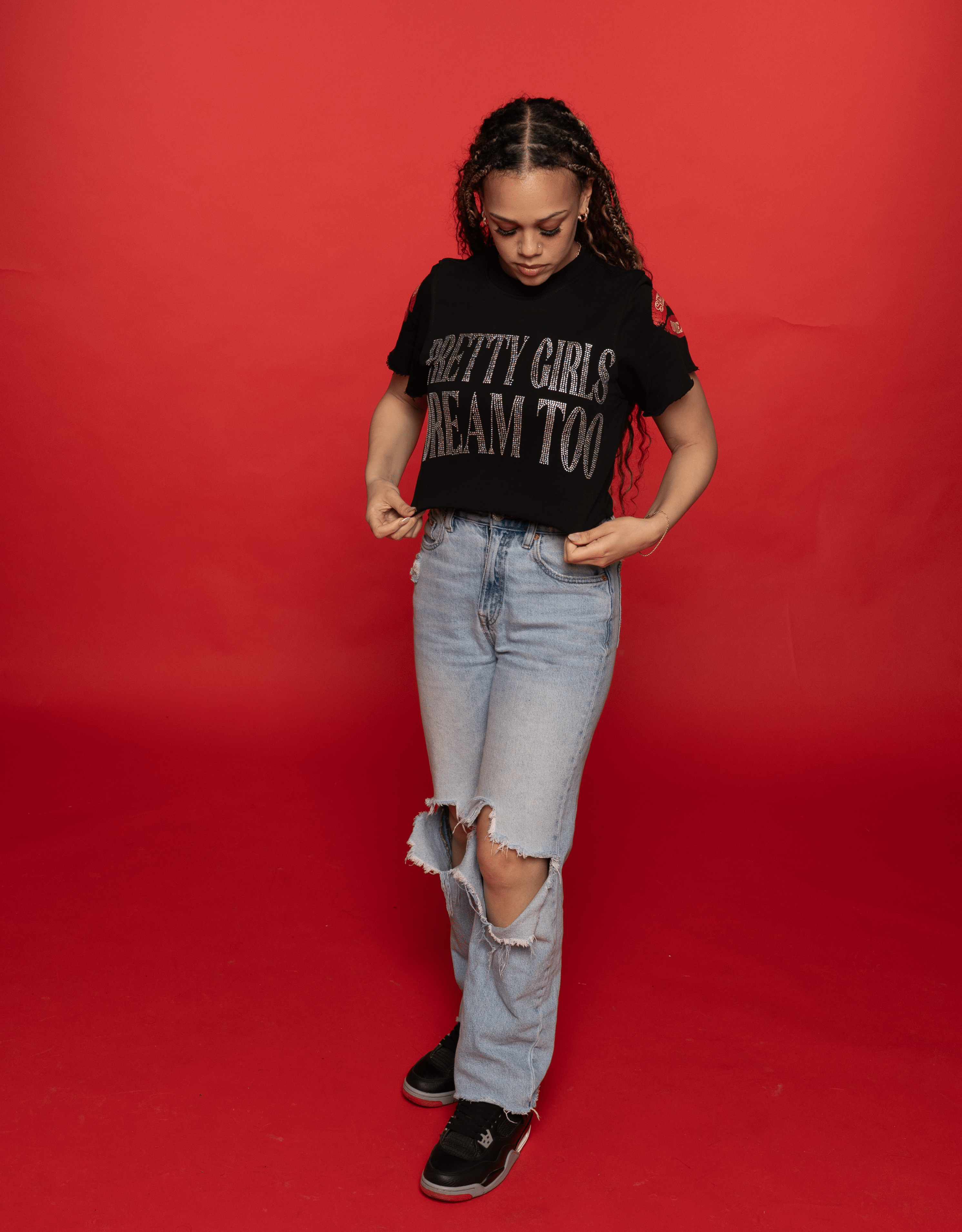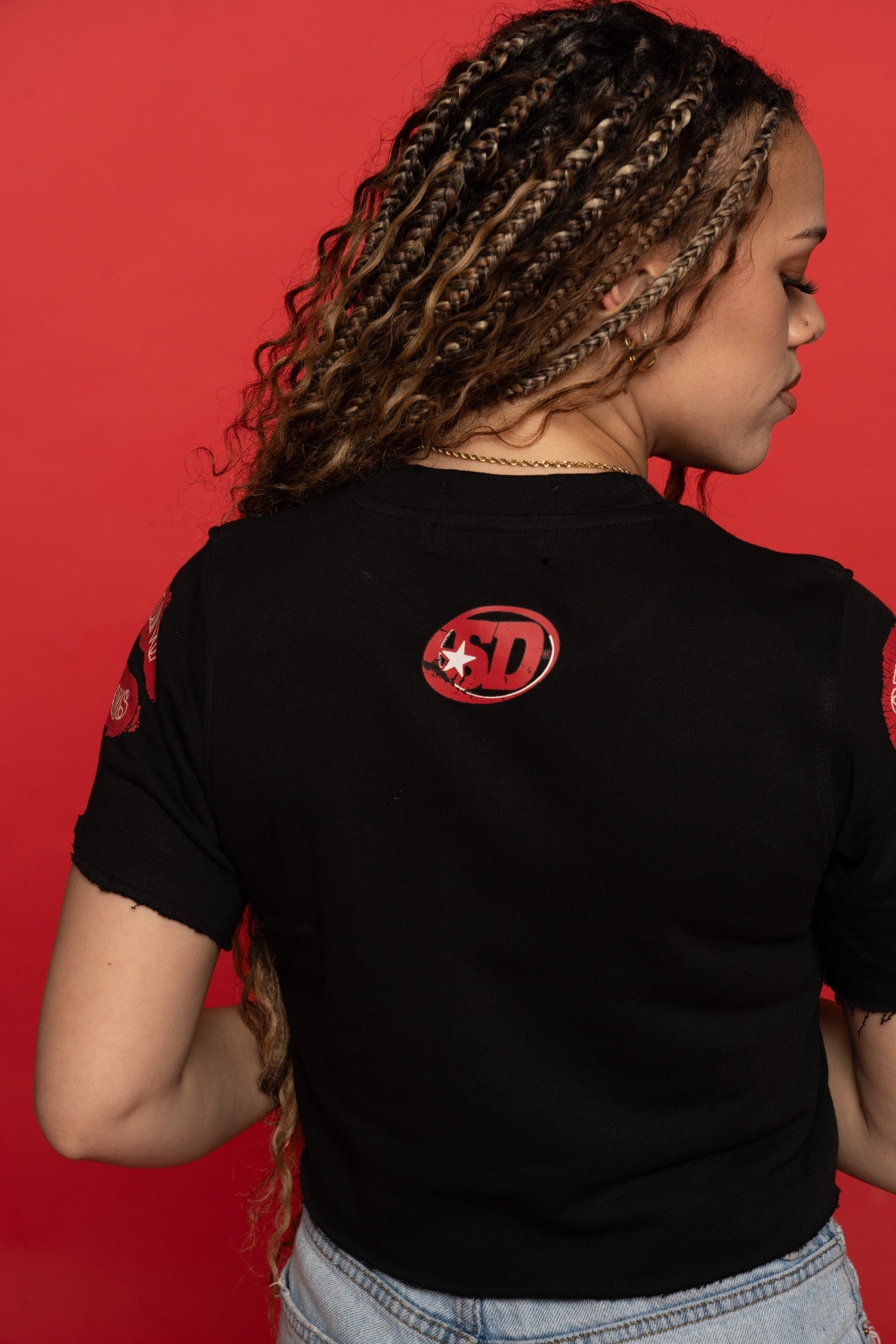 Turn heads with this bold and stylish cropped t-shirt, designed for the modern woman who loves a mix of glam and streetwear! Featuring eye-catching rhinestone embellishments across the chest, this tee adds the perfect touch of sparkle to your everyday look. The shoulder sleeves and back are decked out with high-quality screen prints, delivering vivid, long-lasting graphics that stand out from every angle. Crafted from soft, breathable fabric with a flattering cropped cut, it's perfect for layering or wearing solo